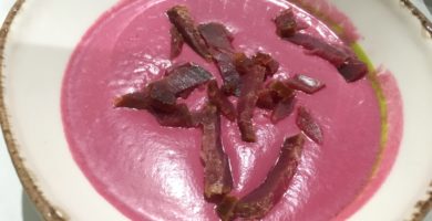 AJOBLANCO DE REMOLACHA CON BROTES Y/O CON VIRUTAS DE MOJAMA. (SIN GLUTEN, SIN LÁCTEOS, SIN SOJA, SIN HUEVO)