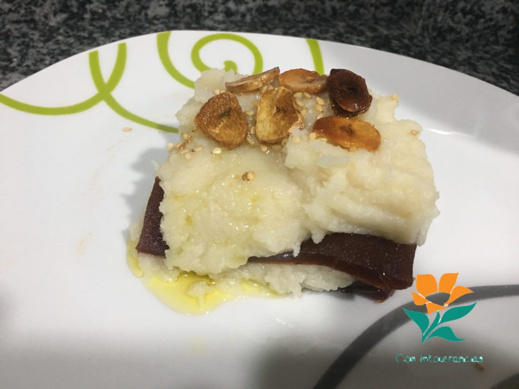 En un plato, disponer una capa de dulce de membrillo, el puré de coliflor y nabo, y repetir la misma operación. Coronar con las láminas de ajo restantes, un chorrito del aceite donde se han preparado los mismos y algunas semillas de sésamo tostado.