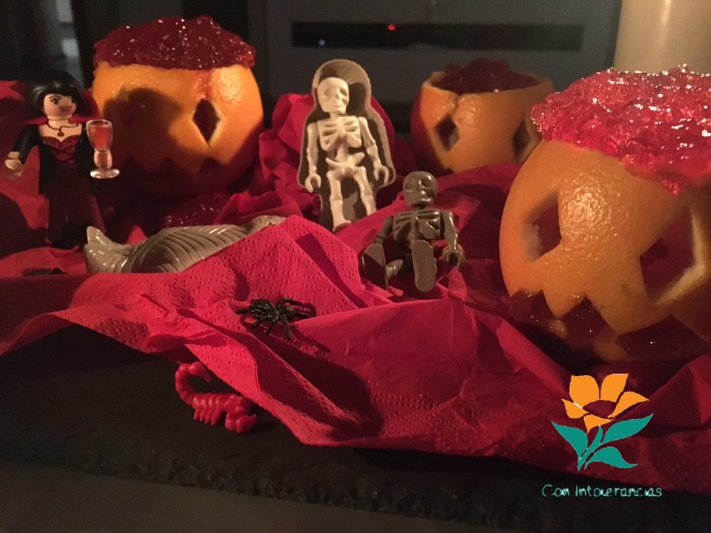 Volcar la gelatina sobre una tabla de cortar (o hacerlo en el mismo molde de aluminio para horno). Picar la gelatina con la ayuda de un tenedor y rellenar las naranjas con ella. Usar una jeringuilla de repostería para pintar un poco de sangre en las comisuras de la boca.