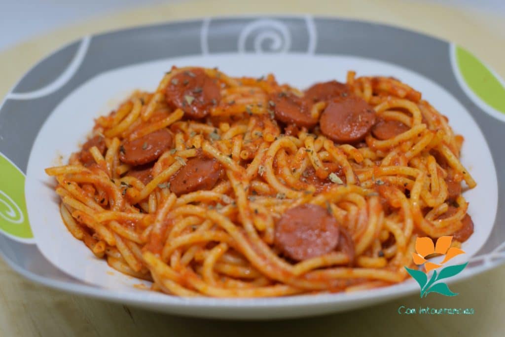 Vamos a ver este plato de espaguetis con salchichas y tomate (o falso tomate) sin gluten, sin lácteos, sin huevo, sin soja y sin frutos secos: