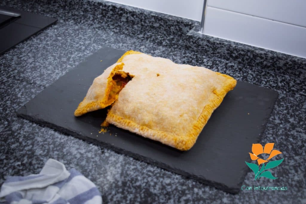 Esta masa de empanada es sin gluten, sin lácteos y sin huevo. Es naturalmente sin soja, sin frutos secos y, además, por el relleno que hemos realizado también es sin tomate, por lo que es apta para muchas personas, y si variáis los rellenos en función de las necesidades alimentarias de aquellos que la vayan a degustar, las posibilidades pueden ser muy variadas.