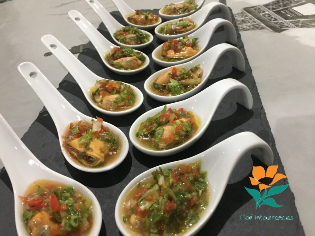 Un rato antes del evento, disponer un mejillón por cucharita y, con ayuda de una cucharilla, añadir la verdura en vinagreta. Servir bien frío.
