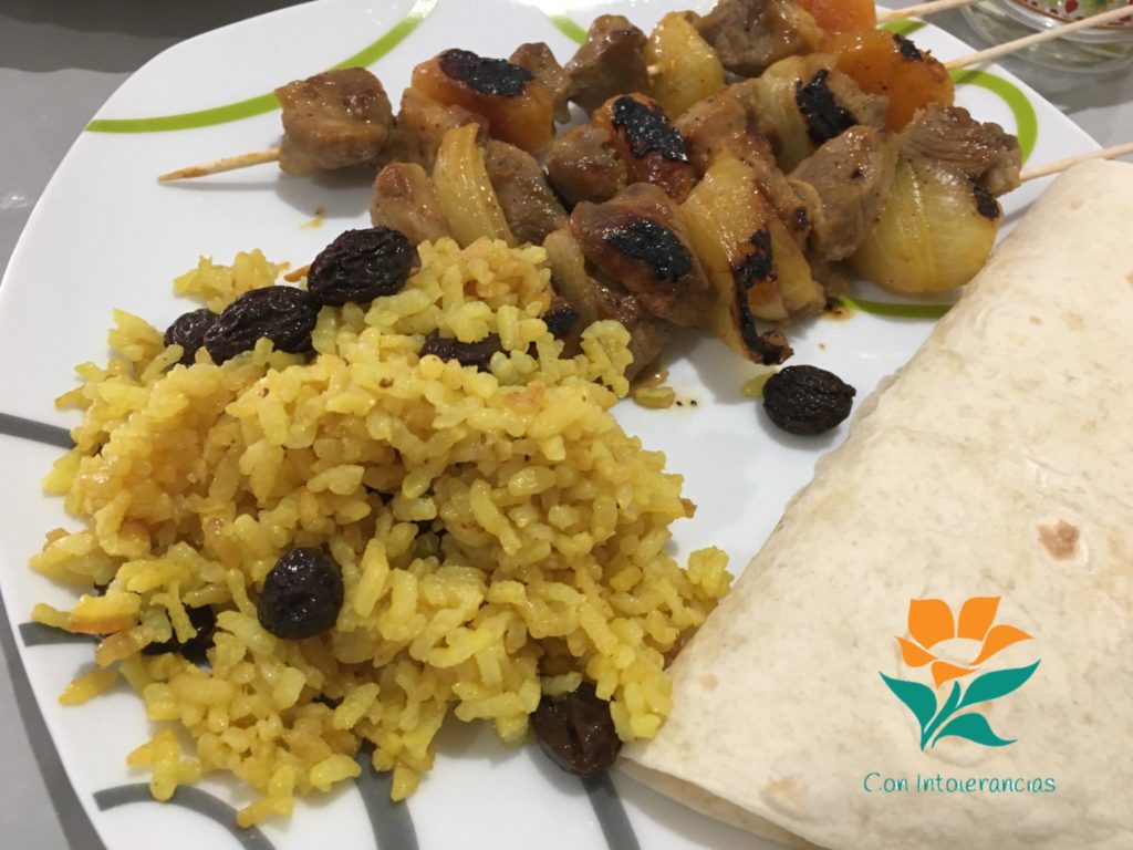 En el menú de hoy, tendremos un arroz para acompañar (geelrijs) y unas brochetas de cordero (sosaties) con especias, además de un postre con fruta (Naartlies al horno).