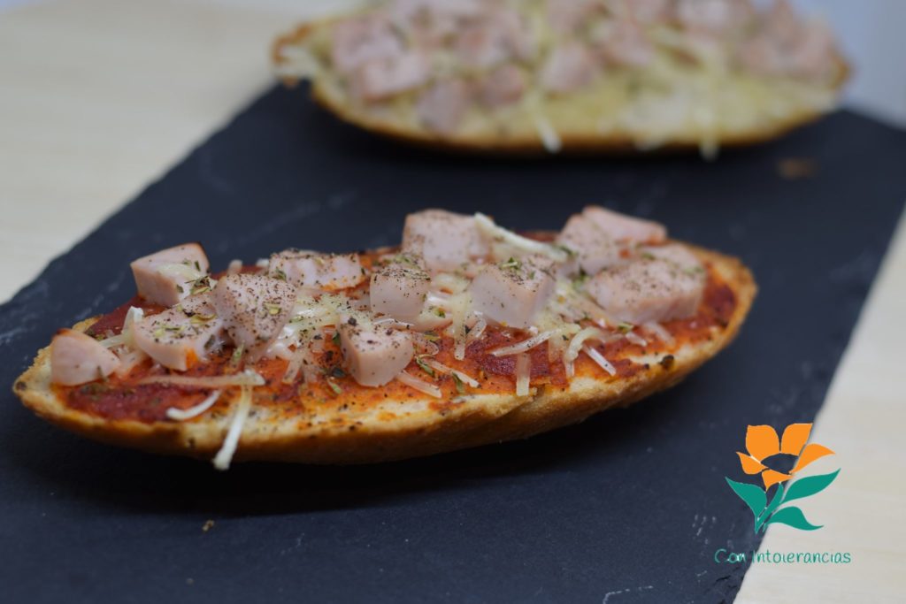 Es tan fácil, sencillo y rápido como tener un pan sin gluten, sin lácteos, sin huevo, sin soja y sin frutos secos (que es en nuestro caso, claro) y ponerle los ingredientes que más te apetezcan por encima, hornear unos minutos y saborear con una película y a relajarse. Para disfrutarlo tanto como hicimos nosotros, vamos a ver la receta: