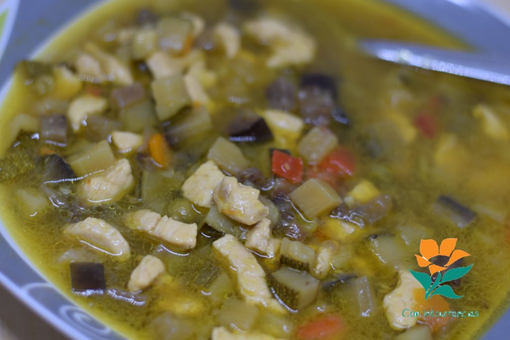 ¿Recordáis que siempre tengo un sofrito que me vale para muchos platos? De hecho el arroz con verduras tiene esa maravillosa mezcla. Hoy lo mezclamos y lo cocinamos con pollo, para darle un toque distinto y para comer esta carne de una forma más sabrosa y de cuchareteo para este tiempo que ya empieza a refrescar por el otoño, con verduras de temporada.