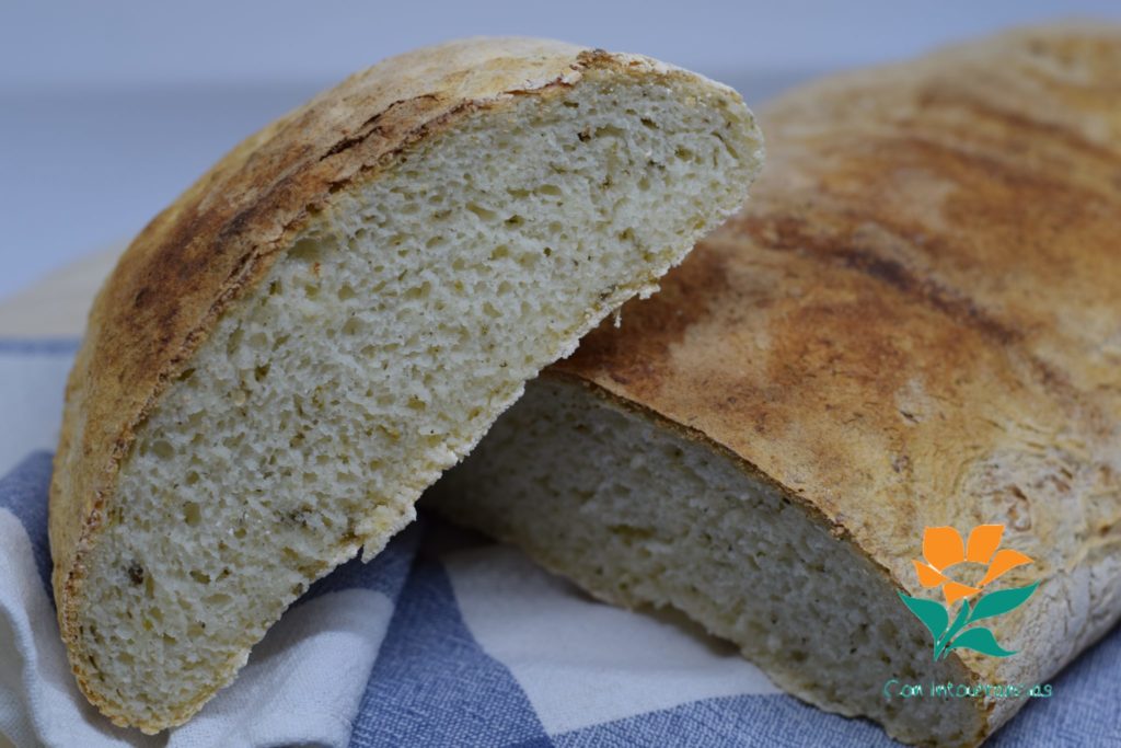 Es un pan que se puede amasar a mano, lo cual es fantástico ya que es muy raro que se pueda amasar de esta manera con harinas sin gluten. Tiene un toque especial al llevar hierbas aromáticas que para acompañar con la comida, o para tostar y acompañar de tomate picado, (quien pueda claro, en mi caso es imposible), una vinagreta… ¡Es genial! Además no lleva sal añadida (cuidado con la harina, sea ésta u otra), ni tampoco lleva aceite, así que para los intolerantes a estos dos ingredientes, sal y aceite, es un pan asequible y fácil de hacer. Vamos con las manos a la masa: