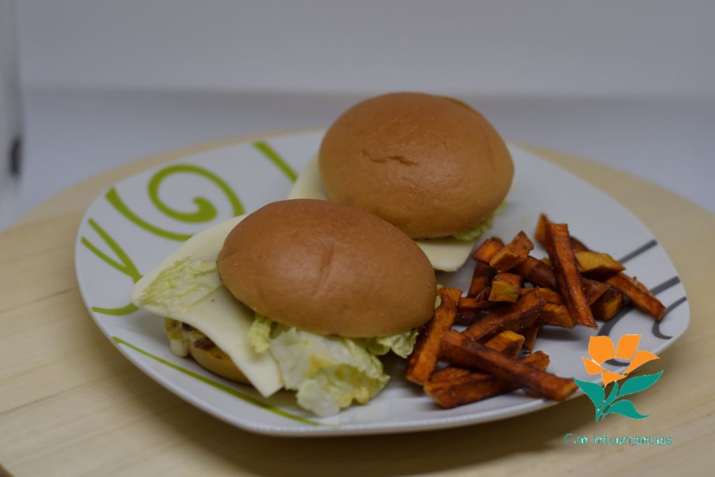 La carne de hamburguesas es casera, por lo que nos quitamos aditivos añadidos a la carne. Lo acompañamos de boniato en lugar de patata ya que no puedo abusar de la patata. Hay gente que se sorprende pero tiene un sabor peculiar, dulzón y sirve genial para sustituir la patata.
